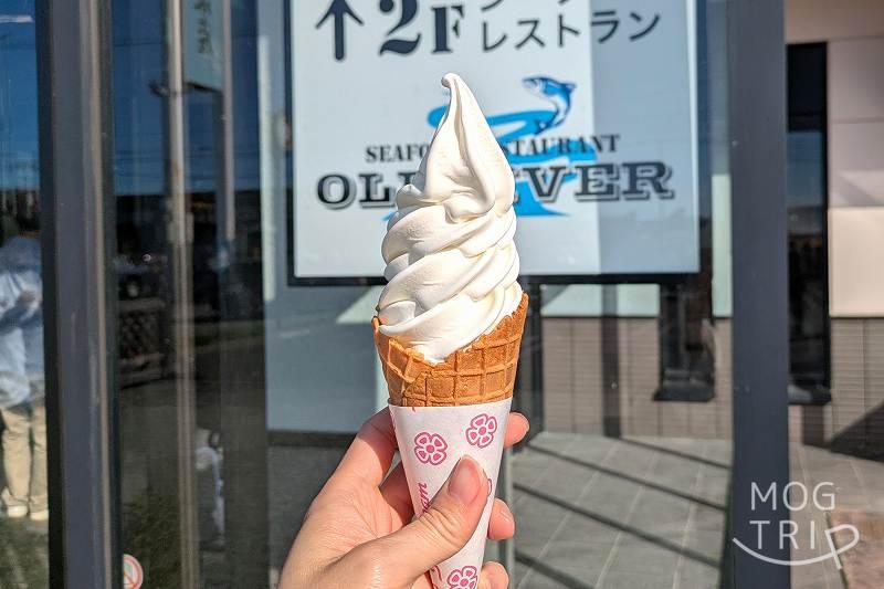 佐藤水産の一部店舗では「塩ソフトクリーム」の販売が行われています。これが地元の方の間で密かな人気に。砂川市〝岩瀬牧場〟の低温殺菌牛乳を使い、イタリアのソフトクリームマシン〝カルピジャー二〟で作るソフトクリームからは、濃厚なミルクの風味が。ほんのり効かせた塩味がミルクの味を引き立てていて、しょっぱくなくてクセになる味わいでした。